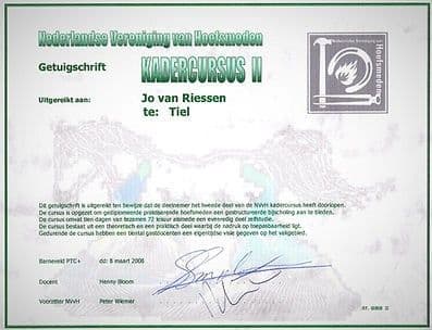 Ook heb ik in 2008 en 2009 de 'Kadercursus Hoefsmid' van Meester-smid Henny Bloom met goed gevolg afgerond.